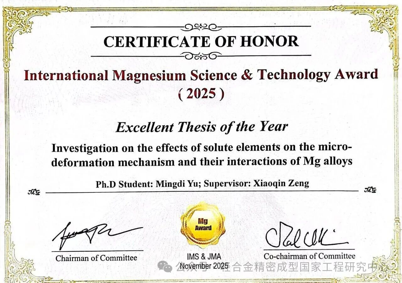 曾小勤教授指导的博士生于铭迪的学位论文“Investigation on the effects of solute elements on the micro-deformation mechanism and their interactions of Mg alloys”获得年度优秀学位论文(Excellent Thesis of the Year)。该博士学位论文结合微纳力学测试与第一性原理计算,系统研究了溶质元素对镁合金中位错滑移及孪晶行为的影响,提出了镁合金多系滑移的调控机制,揭示了镁合金中位错相互作用对塑性变形及应变硬化的影响规律,相关研究成果在Acta Materialia,International Journal of Plasticity等国际顶级学术期刊发表,为高塑性镁合金的设计提供了重要理论依据。