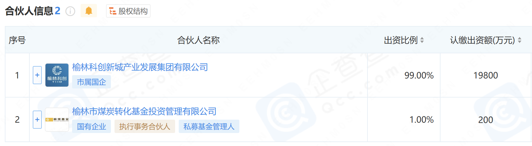 先看这支基金的基本信息,基金全称 “榆林科创新城产业发展私募股权投资基金合伙企业(有限合伙),由科创新城管委会牵头,联合榆煤基金公司和科创新城产业发展公司共同设立。榆煤基金公司同时也是这支基金的基金管理人。基金规模2亿元,科创新城产业发展公司和榆煤基金公司分别认缴出资额1.98亿元、200万元,占比分别为99%、1%。