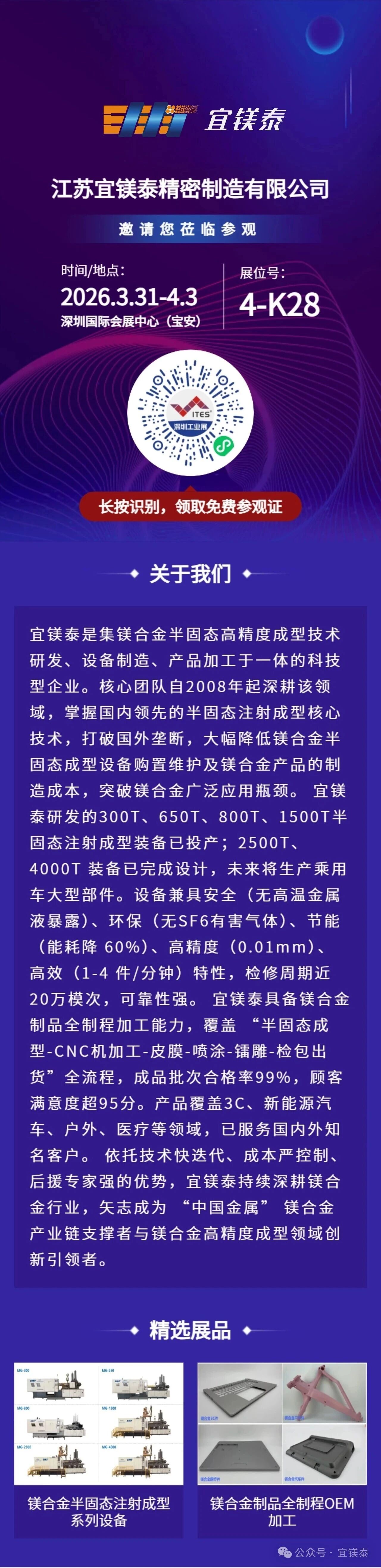 江苏宜镁泰精密制造有限公司携镁合金半固态系列设备与镁合金全制程产品,亮相 2026 深圳工业展(3.31-4.3,深圳国际会展中心宝安馆,展位 4-K28)。宜镁泰掌握国内领先半固态成型核心技术,设备兼具安全、环保、节能、高精度等优势,可覆盖镁合金电动自行车、新能源汽车、3C消费电子、户外轻量化装备、医疗、人形机器人和军工等领域。现诚邀行业伙伴莅临展位,共探镁合金轻量化应用新机遇,长按海报二维码即可领取免费参观证。