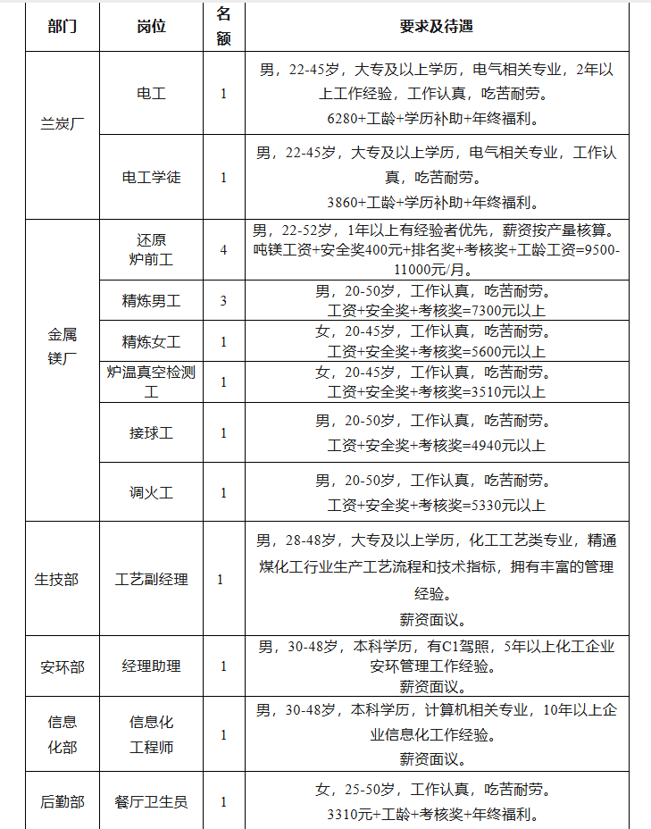 备注:1、用餐:自助餐+美食城;2、住宿:两人一间标准间,独立卫生间,网络电视,无线网络全覆盖;3、县城通勤车每日2趟;4、春节3倍工资+法定假日免费餐+生日送蛋糕等多项劳保福利;5、室内体育馆,文体设施齐全,供员工健身娱乐。备注:面试时请提供3张1寸彩照,身份证原件,大专以上需提供毕业证等证件,每天有往返府谷的通勤车,通勤车司机电话13992246515。