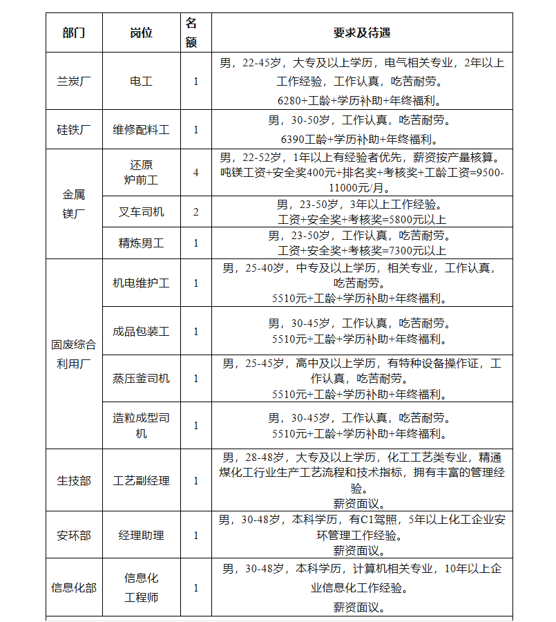 备注:1、用餐:自助餐+美食城;2、住宿:两人一间标准间,独立卫生间,网络电视,无线网络全覆盖;3、县城通勤车每日2趟;4、春节3倍工资+法定假日免费餐+生日送蛋糕等多项劳保福利;5、室内体育馆,文体设施齐全,供员工健身娱乐。备注:面试时请提供3张1寸彩照,身份证原件,大专以上需提供毕业证等证件,每天有往返府谷的通勤车,通勤车司机电话13992246515。