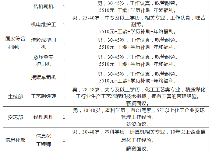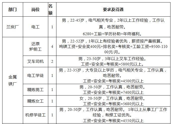 (一)兰炭厂、金属镁厂招聘