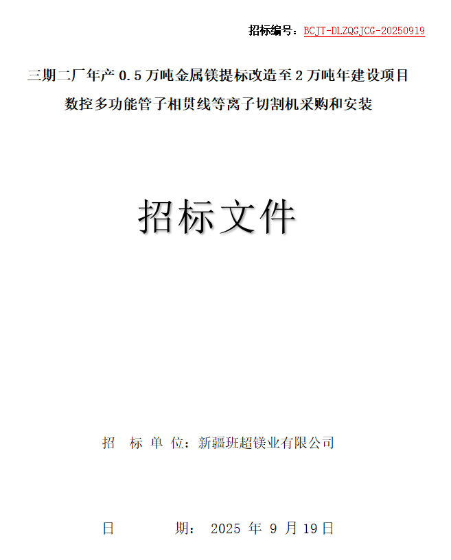 本次招标范围:[1台数控多功能管子相贯线等离子切割机采购和安装]