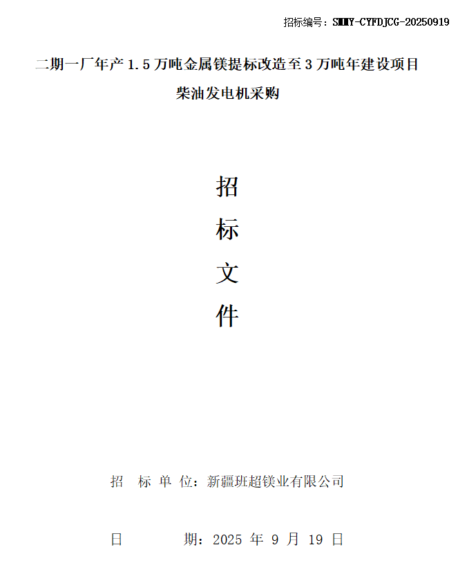 本次招标范围:[盛镁镁业有限公司厂区一台200KW柴油发电机]