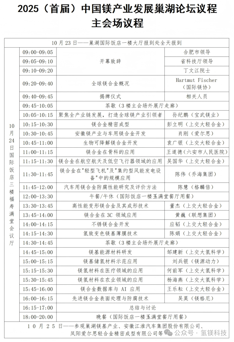 友情提示: 2025(首届)中国镁产业发展巢湖论坛将与10月23日-10月25日在安徽巢湖盛大召开,会议日程已经确定并发布,报名已经接近尾声。