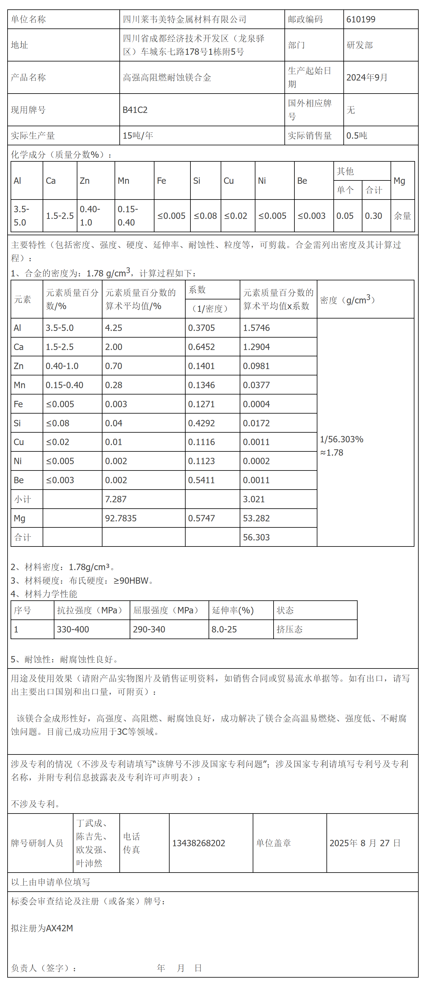 【征求意见】四川莱韦美特金属材料有限公司镁合金牌号征求意见(AX42M)