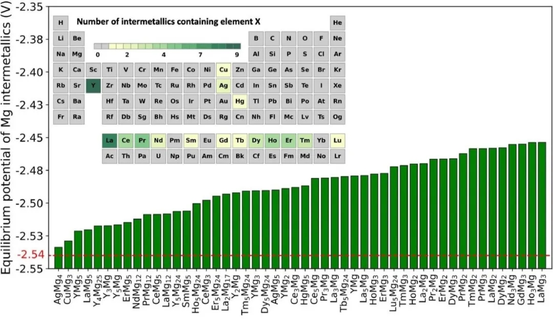 在商用镁合金中,大多数析出相比镁基体电化学稳定性更高,并在电偶腐蚀过程中作为局部阴极。Sudholz等人研究了二元镁合金析出相的动电位极化曲线,发现除Mg2Ca外,大多数金属间化合物的腐蚀电位均高于纯镁。根据腐蚀热力学理论,镁基体与析出相之间较大的腐蚀电位差会提高电偶腐蚀反应趋势。假设镁及其金属间化合物的溶解反应发生在常温下的中性溶液中,所有离子浓度均为10−6 mol/L。图1显示了在329种镁金属间化合物中,50种与镁基体具有最小平衡电位差的析出相。结果表明,大多数含有稀土元素的金属间化合物表现出较低的腐蚀倾向。