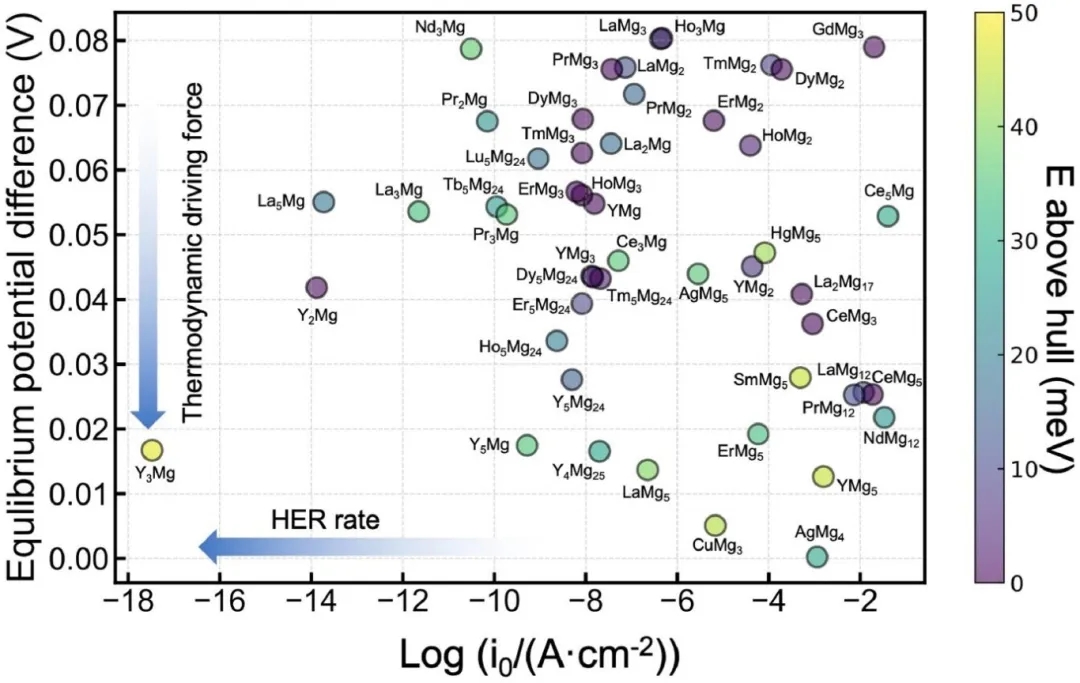 除了平衡电位差外,阴极氢气析出反应的反应速率也是评估镁合金腐蚀速率的重要筛选标准之一。为了研究析出相表面的析氢反应动力学,首先通过计算表面能确定每种析出相的最稳定表面。对于大多数镁金属间化合物,最稳定的表面多为(100)或(111)表面。随后,通过pymatgen软件包构建氢原子吸附模型并通过高通量计算得到相应的吸附构型及吸附能。基于Nørskov等人提出的HER动力学模型,本文进一步利用计算得到的吸附能获得析氢交换电流密度。图2展示了包含相稳定性、平衡电位差和交换电流密度的综合筛选结果。点的颜色表示金属间化合物的稳定性(深颜色代表更稳定),X轴表示通过析氢动力学模型计算得到的阴极交换电流密度,Y轴表示析出相与镁基体之间的平衡电位差。根据腐蚀反应热动力学,较小的平衡电位差和较低的HER交换电流密度有助于降低腐蚀反应速率。因此,图2左下角的镁-稀土元素金属间化合物,如Y3Mg、Y2Mg和La5Mg等是潜在的可以有效抑制电偶腐蚀反应的镁合金二元析出相。