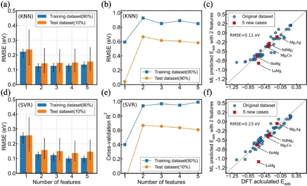 图3展示了采用支持向量回归(SVR)和K近邻(KNN)算法构建的吸附能回归模型。图3(a)和(d)展示了使用不同特征个数的KNN和SVR模型精度(RMSE)。当使用两个输入特征时,两种机器学习算法的预测精度相当,RMSE为0.13eV。根据图3(b)和(e),随着使用特征数量的增加,机器学习模型的预测精度会先提高后略微降低。精度初期的提高表明更多的特征可以提升模型的预测能力,但过多的输入特征会导致模型过拟合。KNN和SVR模型的到达最佳预测精度时分别使用2个和4个特征。