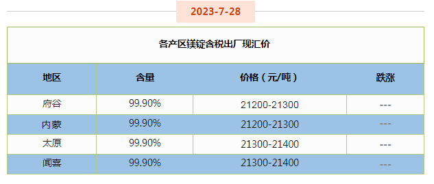 市场综述:七月最后一周,金属镁市场重心上移,截止到本周四,国内金属镁主流地区价格为21500-21700元/吨,较上周同期价格上涨约800元/吨,涨幅3.86%。本周,金属镁价格走势偏强,主因下游市场月底集中补货,出口商交付订单,整体采购量增多,以及当前厂家库存压力不大,工厂惜售情绪偏浓,出货量有限。周内,府谷地区镁厂报价由20700元/吨,最终涨至21500元/吨,随着镁价不断探涨,下游市场略显高价抵触,需求逐渐放缓,21500元/吨暂无成交,当前成交价在21200-21300元/吨附近。