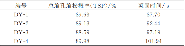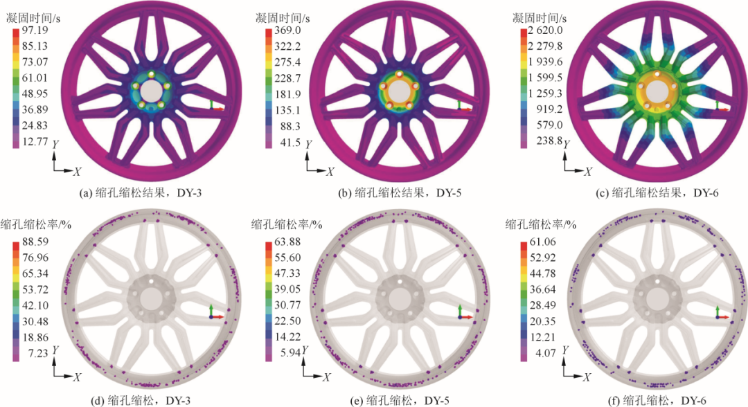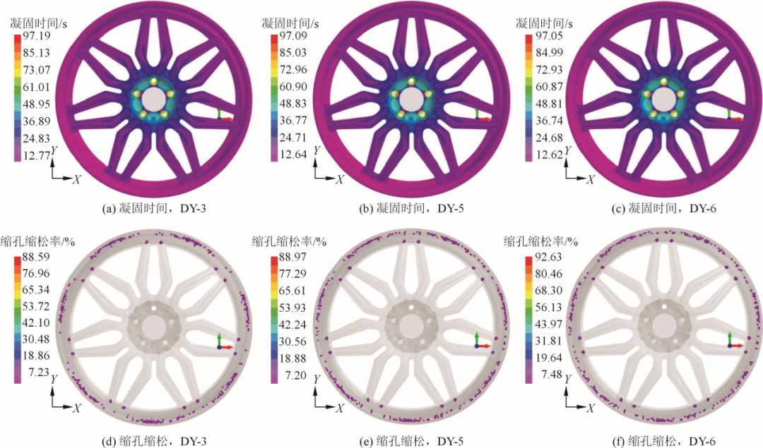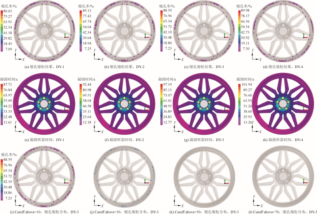 选取4种试验方案下轮毂的总缩孔缩松概率[Total shrinkage porosity (TSP)]、凝固时间(Time to solidus)对轮毂的铸造缺陷进行对比分析,见表2。可以看出,随着铸造温度增加,轮毂凝固所需时间不断延长。同时比较4种浇注温度工艺制度下的缩孔缩松分布情况,DY-3缩孔缩松结果最优,这是因为DY-3充型结束时的温度较高,凝固过程中可以更好地进行补缩,故而缩孔缩松最少。