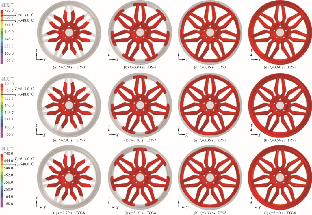 选取DY-3、DY-7、DY-8等3组试验方案进行模具温度对低压铸造过程影响的研究。图6为不同模具温度时轮毂的充型模拟结果。可以看出,不同模具温度条件下模具的充型保持平稳流动,没有发生紊流飞溅现象,整个充型顺序保持一致。模具温度提高,模具充满时间变化很小,模具温度对充型速率的影响很小。
