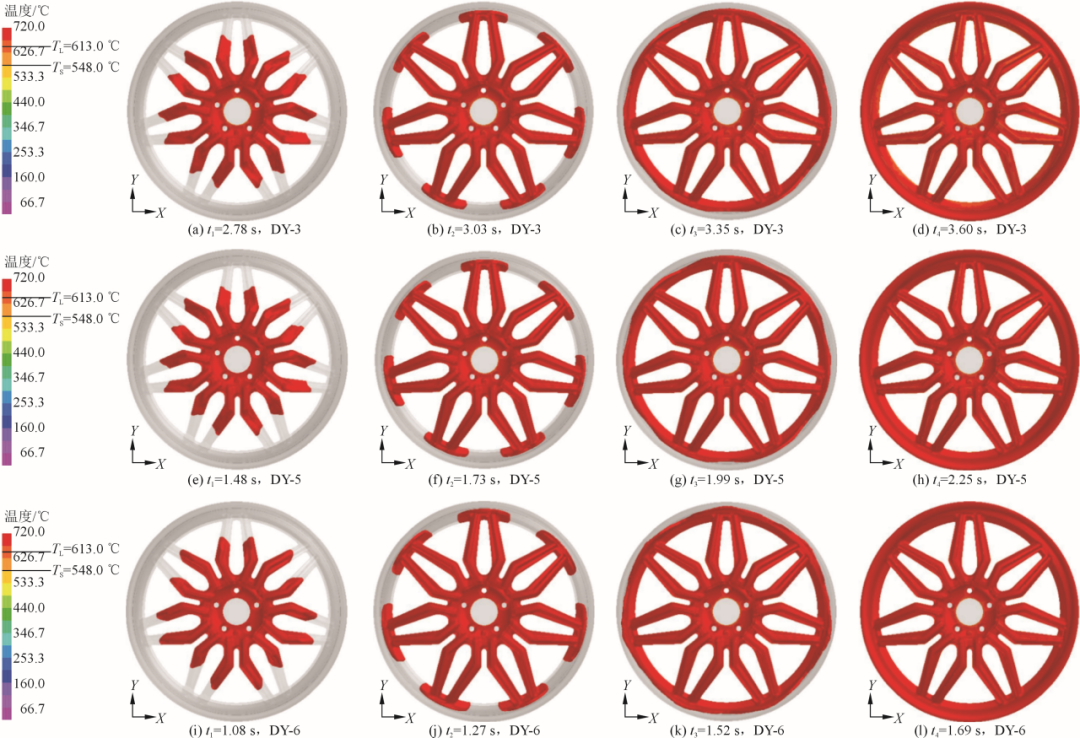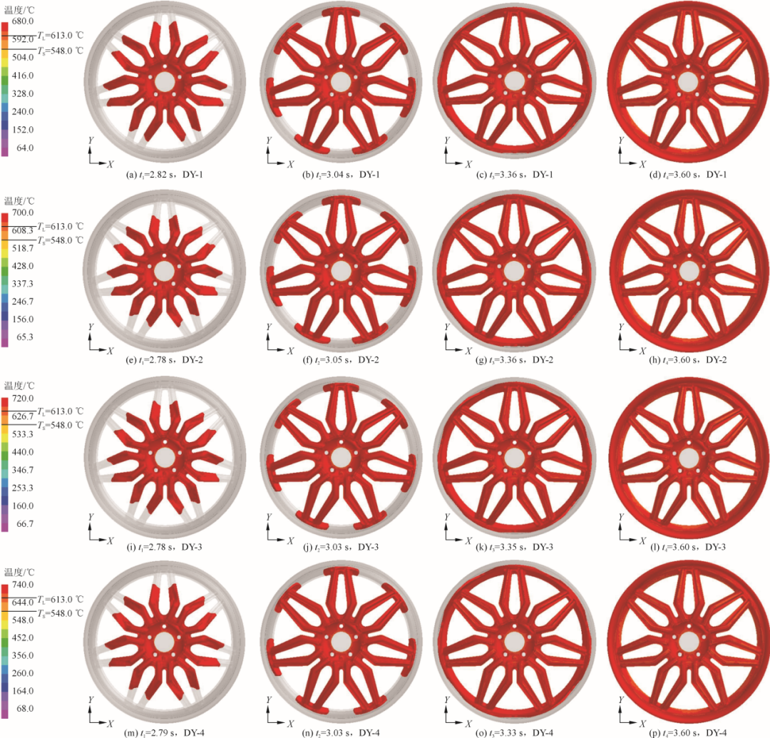 选取DY-1、2、3、4试验方案进行浇注温度对低压铸造过程影响的研究。图2为不同浇注温度时低压铸造轮毂的充型模拟结果,可以看出,不同浇注温度下模具的充型保持平稳流动,没有发生紊流飞溅现象,整个充型顺序保持一致。随着浇注温度升高,充型所需要的时间略有变化,表明浇注温度对充型效率影响不大。