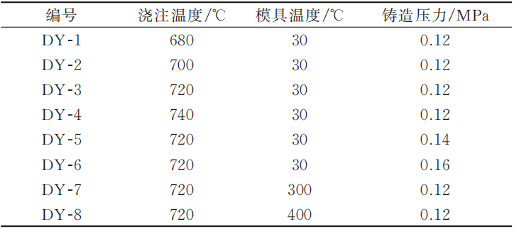 在常规低压铸造轮毂过程中,铸造工艺参数如浇注温度、模具温度以及铸造压力等与轮毂的品质紧密相关。针对这些因素设计了3因素4水平的正交试验设计,见表1。对不同参数下轮毂低压铸造过程进行数值模拟,研究轮毂铸造压力及温度场的分布规律,并对其质量进行分析。