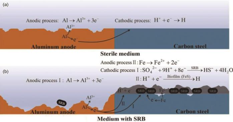 图4 在不含和含SRB的富集人工海水中铝阳极和碳钢之间的电偶腐蚀过程示意图