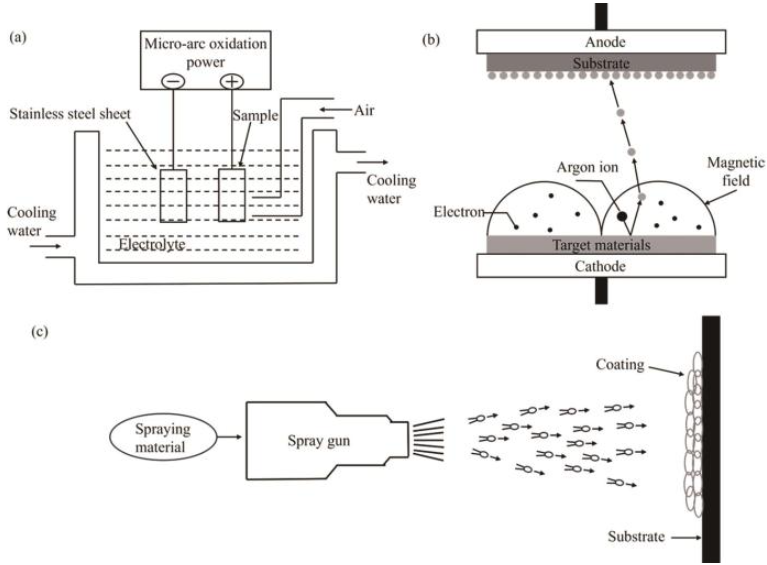 (a) micro-arc oxidation, (b) magnetron sputtering, (c) thermal spraying