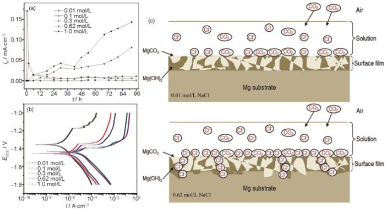 (a) corrosion current density curves, (b) polarization curves, (c) corresponding corrosion models