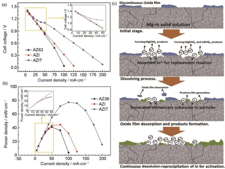 (c) schematic diagrams of the dissolution-reprecipitation mechanism of magnesium alloys activated by indium
