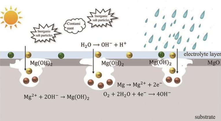 Fig.2 Atmospheric corrosion mechanism of magnesium alloys