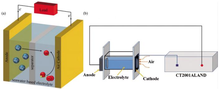 Fig.6 Working principle diagram of seawater battery (a) and diagram of discharge device (b)