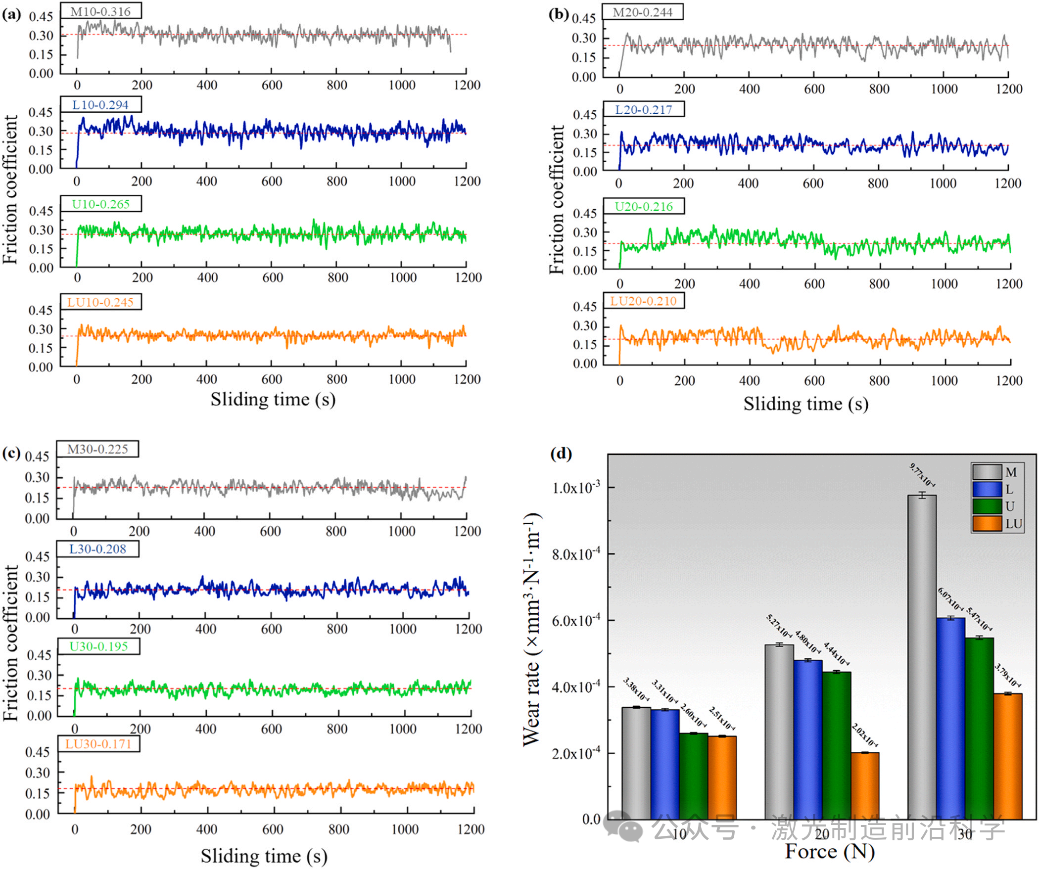 图3 M、L、U和LU试件的摩擦因数分别为:(a)10N;(b)20N;(c)30N;(d)不同载荷下的磨损率
