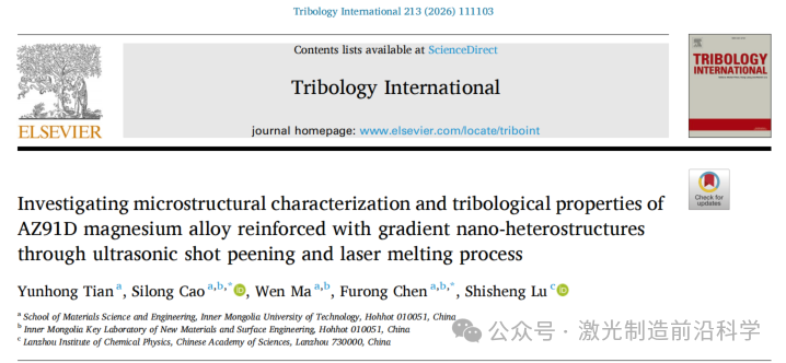 镁合金因其低密度、高比强度在航空航天和汽车工业中具有广泛应用前景。然而,其低表面硬度和较差的耐磨性严重制约了其在运动部件中的应用,传统表面改性技术存在膜基结合弱、涂层不均等问题。基于此,内蒙古工业大学曹四龙/陈芙蓉团队联合兰州化学物理研究所在《Tribology International》发表最新研究,采用激光熔覆与超声冲击复合工艺,在AZ91D镁合金表面成功构建了梯度纳米异质结构,实现了硬度提升130%、磨损率降低61.7%的显著效果,为解决镁合金耐磨性差的瓶颈问题提供了新的技术途径。