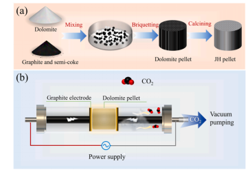 图7 (a)用于焦耳热煅烧的白云石压制; (b)焦耳热煅烧示意图