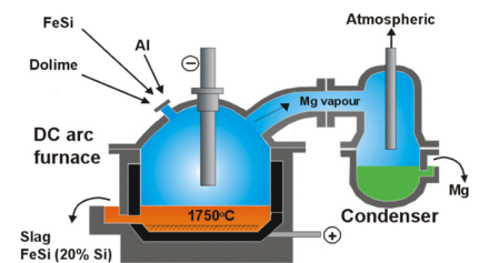 南非国家矿物研究机构Mintek提出了一种电弧炉常压炼镁的新工艺(MTMP法),该工艺以煅烧白云石为原料,硅铁为还原剂,铝为催化剂,在电弧炉中进行镁还原反应(图9)。MTMP法使用热效率极高的电弧炉对反应物料加热,此种方式可使反应罐内温度达到1750 ℃以上,因而无需真空环境降低反应温度,同时电弧炉的高温可以使得炉内形成熔池,加快反应动力学进程,进而实现常压下的原镁连续生产。Mintek在2004年11月对MTMP法进行了为期8天的中试规模的连续化运行试验,在常压下冶炼了约30t白云石,共生产了3.5t的粗镁,并基于此对MTMP法与皮江法的吨镁生产成本进行了对比,结果表明MTMP法的生产成本仅为皮江法的3/4左右。