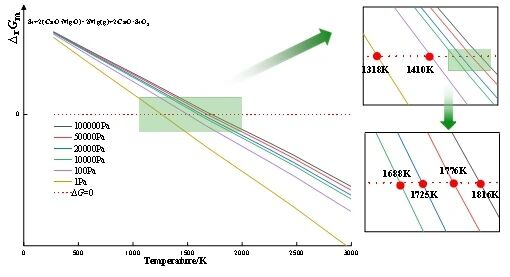 煅白还原是皮江法炼镁的核心环节,传统皮江法对真空环境要求高,原因是该还原反应在大气压下的热力学起始温度为1816K,而1Pa时的热力学起始温度则为1318K(图8),因此实际生产中常会保持近真空环境,以降低反应起始温度。