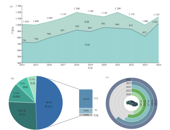 图3 (a)全球与中国原镁年产量; (b)2024年中国原镁应用结构; (c)2020—2024年汽车行业年用镁合金总量