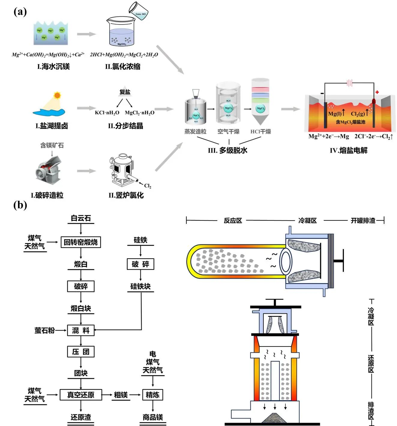 图4 (a)电解法炼镁流程; (b)皮江法工艺流程与横罐、竖罐皮江法示意图