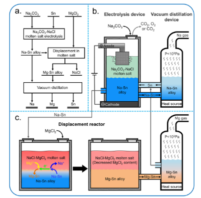 图6 清洁、可持续的钠、镁金属生产工艺[43]: (a)电解—精馏和电解—置换精馏原理; (b)电解—精馏制备钠的设备原理图; (c)电解—置换精馏制备镁的装置示意图