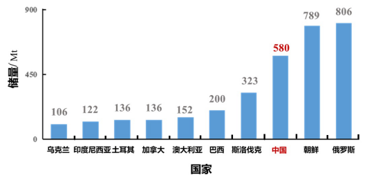 全球镁资源主要以菱镁矿(MgCO₃)和白云石(CaMg(CO₃)₂)为主,分布广泛。截至2022年底,全球镁矿探明储量(以MgCO₃计)37亿t,其中中国约5.8亿t,占世界储量的15.68%,是第三大镁矿储量国,其他主要储量国有俄罗斯、朝鲜、巴西、澳大利亚、斯洛伐克等(图2)。除了矿石资源外,还有一部分的镁资源以氯化镁的形式储存在盐湖、海洋中,如我国青海的察尔汗盐湖等。