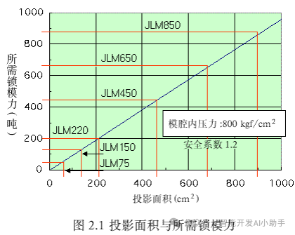 成形机的大小的选择是从产品的的投影面积来计算出锁模力而定。设总投影面积(包括主流道,分流道,溢流槽)为 A(cm2),射出时模具内压为 P(kgf/cm2),所需锁模力的计算如下:机器的锁模力 ≥ A x P x 安全系数。通常,触变成形时金属模具的模腔内的压力以 800kgf/cm2来计算。