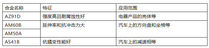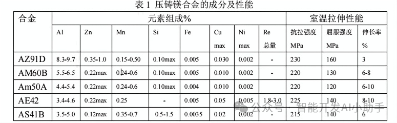 目前AZ及 AM这两种系列合金占镁汽车结构件的 90%,但它们在 150℃以上时其强度显著下降。 目前得到工业应用的压铸镁合金主要有 4个系列,即 AZ系列(Mg-Al-Zn-Mn);AM系列(Mg-Al-Mn);AS系列(Mg-Al-Si);AE系列(Mg-Al-稀土)。2006年度开发的 2108镁合金用的是 AZ91D。表 1中给出了它们中的常用合金的名义成分和性能。