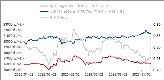 2025年9月,国内铝价飙升至21030元/吨,而国标Mg99.90镁锭价格仅为16800元/吨,镁铝价格比跌破0.81。2025年11月,镁均价报16000元/吨左右,铝价约21500元/吨左右,镁铝价格比维持在0.75左右。相比2024年镁铝价格比常在1.1-1.3之间波动,2025年价格比已下降约30%-40%。