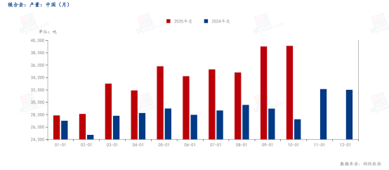 2025年,中国镁合金产量呈现持续增长态势,月度产量数据清晰地反映出行业在新能源汽车、消费电子、低空经济及机器人等新兴领域需求拉动下的强劲扩张势头。根据Mysteel统计的月度产量数据,2025年1-11月中国镁合金产量已突破40万吨大关,全国总产量达到41.97万吨,较2024年全年约34.32万吨的产量水平实现了显著提升,同比增长幅度超过22%。