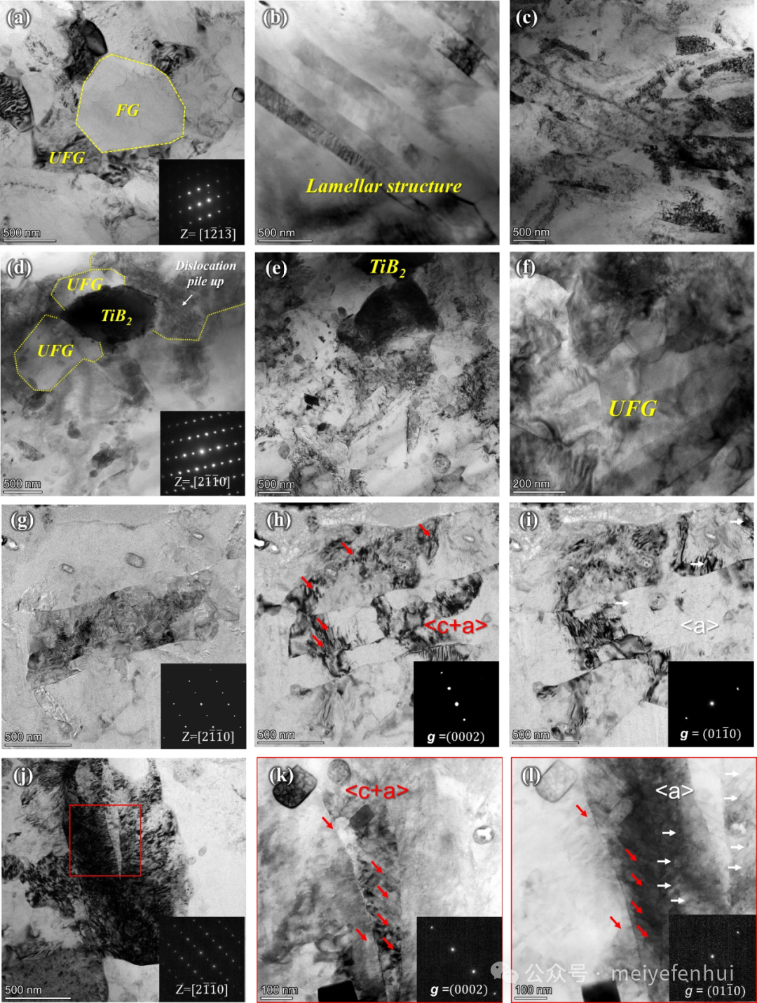 图2 旋锻态镁锂基复合材料的超细晶与位错亚结构特征