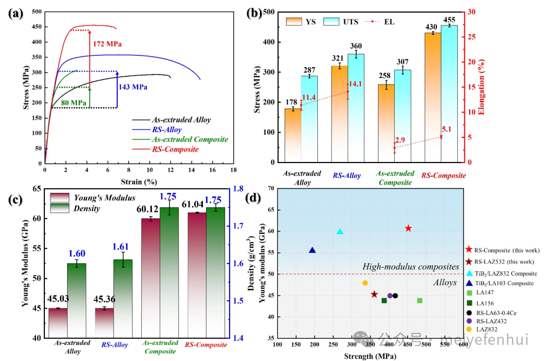 研究团队通过引入微米级TiB2增强颗粒并结合旋锻塑性加工技术,在镁锂基体中诱导形成大量的位错亚结构和纳米级Li(Al, Zn)界面析出层。该界面层在高模量TiB2颗粒与Mg-Li基体之间形成应变桥梁,有效缓解了应力集中与界面失配。通过同步辐射原位拉伸实验及相场与有限元模拟,系统揭示了界面析出层在应力传递与协调变形中的关键作用。最终成功制备出兼具超轻、高强与高模量特性的镁锂基复合材料。该材料在仅有1.75 g/cm3的低密度下,实现了455 MPa的抗拉强度与61 GPa的杨氏模量,其模量和强度均显著高于传统镁合金体系,展现出优异的轻质高模量结构材料性能潜力。