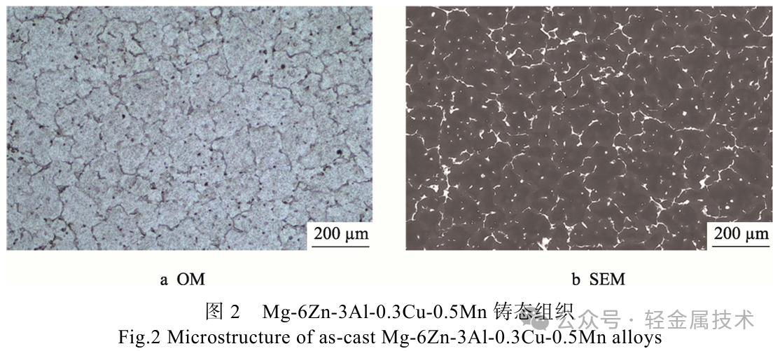 此外,上海航天精密机械研究所基于砂型大熔炼量铸造制备了Mg-6Zn-3Al-0.3Cu-0.5Mn合金铸件,图2为其铸态组织,该合金经过固溶与时效处理后,室温抗拉强度与断后伸长率分别达到280MPa和 9.2%,相较于ZM5等传统非稀土低成本镁合金,在力学性能上具有一定优势。