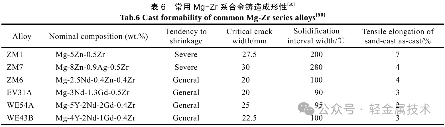 如表6所示,稀土的加入可提升镁合金的铸造性能,如ZM3、ZM6、EV31A、WE43B、WE54A等稀土铸造镁合金的凝固温度区间相对Mg-Al-Zn系合金较窄,但仍在50 ℃以上,凝固温度区间的降低明显改善了合金的显微缩松倾向。但由于离异共晶相比例较高,铸态合金的断后延伸率较低,冷、热裂倾向较高,稀土的添加降低了铸件的抗裂能力。 国内外学者对铸造镁合金的成形工艺性开展了较多研究。顾皞等[51]对比了Mg-Gd-Y合金的铸造性能,发现VW103和VW63均具有较低的热裂倾向,原因为Mg-Gd-Y系合金拥有较狭窄的凝固温度范围,更容易在铸件凝固方向上形成较大的补缩倾角,从而降低热裂敏感性。同时,VW63相较于VW100具有更少的稀土,在塑性和抗收缩方面性能更优,因此冷裂倾向更低。