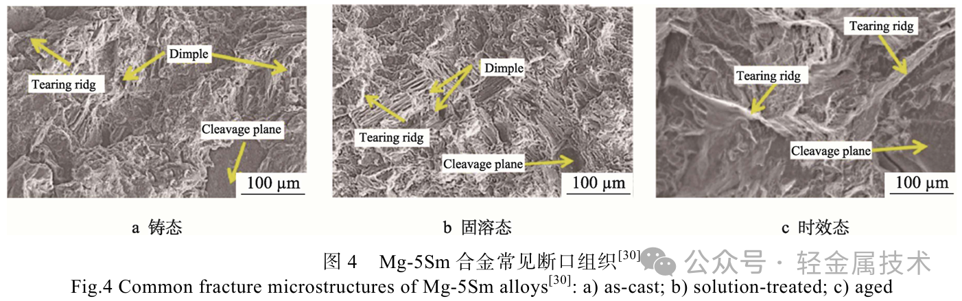 Sm 作为一种低价稀土元素,由于其在镁中固溶度相对较低,同时具有较好的固溶和时效强化效果,可在低溶质含量条件下实现镁合金的高强化,因此是低成本稀土铸造镁合金中重要的合金化元素[27]。利用价格较为便宜的Sm替代镁中部分价格昂贵的如Gd、Y、Dy等重稀土元素,不仅可以降低合金制备成本,有时甚至可以达到更好的强化合金的目的。吴德勇[28]在Mg-3Y-2Zn-0.6Zr合金中分别添加了少量的Gd、 Sm元素,并进行了组织和性能的对比分析,研究表明,相比于添加Gd元素,添加少量的Sm对力学性能的改善更佳,其中Mg-3Y-1Sm-2Zn-0.6Zr在T6态的力学性能最佳,其室温抗拉强度、屈服强度、延伸率分别可达224MPa、120MPa、10.9%,同时合金熔配成本低于50元/kg。苏昕等[29]基于重力铸造条件, 研究了Mg-5.8Sm-0.4Zn-Zr铸造镁合金的热处理组织和力学性能演变,发现经T6处理后,合金抗拉强度为193.2MPa,延伸率仅为0.5%。Sm元素加入过多对合金充分固溶和塑性提升均不利,如图4所示,Mg-Sm二元合金的典型断口组织大都含有大量撕裂棱与解理面,表现为脆性断裂。