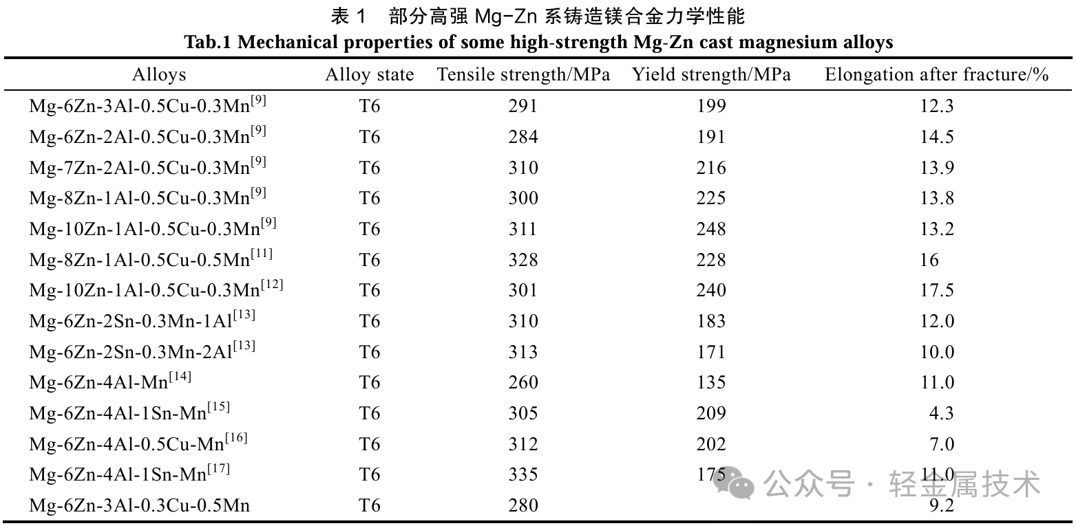 因此,Mg-Zn-Al三元系合金得到较多研究,其热点主要集中在Zn与Al的含量、比例调控以及其他元素的微合金化方面。如Zhang等[8]研究了Al含量对Mg-6Zn合金组织及力学性能的影响,发现当Al的质量分数高于3%时,合金中形成了连续的Mg17Al12相,对合金的塑性及抗拉强度不利,当Al的质量分数低于3%时,力学性能随Al含量的增加而提升。通过其他合金元素的微合金化获得特定的微观组织的研究也受到研究者的关注,如李培亮[9]基于Cu提升析出相弥散效果研发的Mg-10Zn-Al-0.5Cu-0.5Mn合金(T6)的室温抗拉强度、屈服强度、断后伸长率分别达到336.9MPa、292.6MPa、11.2%。Mg-Zn-Al-Cu-Mn系列合金也在非稀土铸造镁合金中具有最高的力学性能,该系列合金的典型合金成分与力学性能如表1所示。
