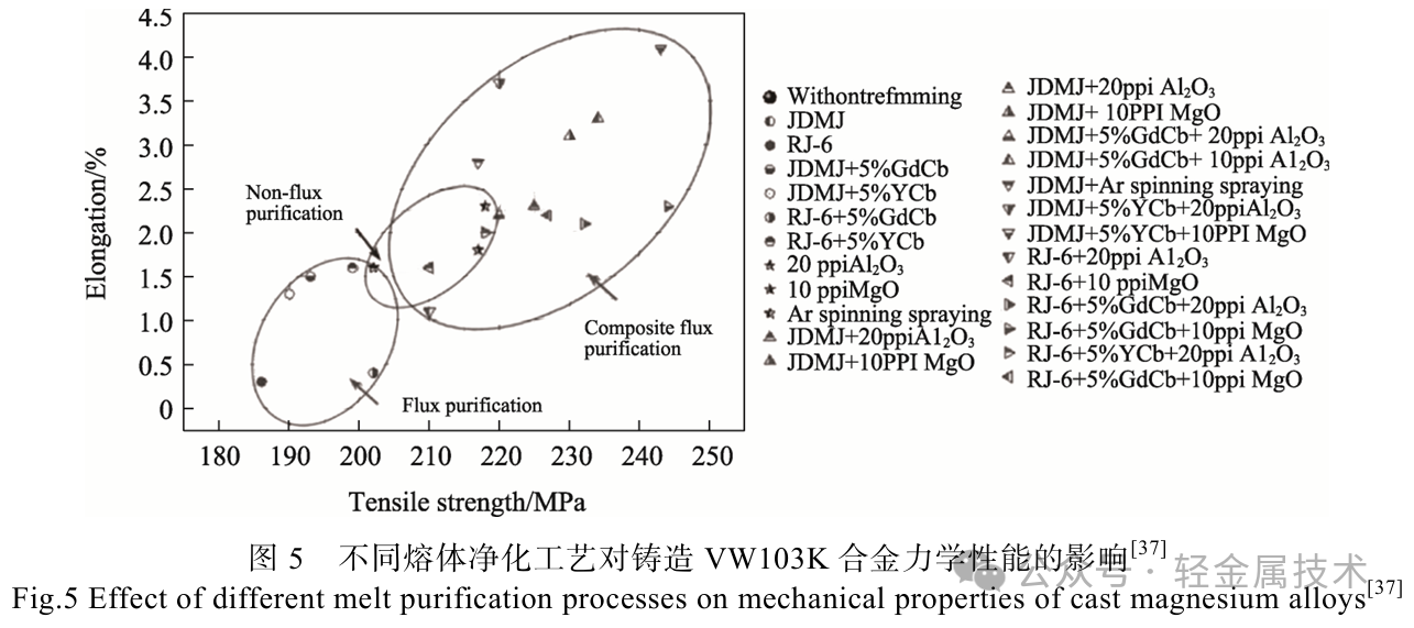 国内对镁合金熔体净化进行了较多研究,在物理净化方面,Wu等[38]采用MgO泡沫陶瓷过滤器对AZ91废料熔体进行净化,合金的力学性能得到显著提升,且该物理过滤方法也具备低成本特点。在复合净化方面,吴国华等[37]开发了稀土镁合金专用精炼剂JDMJ,结合旋转喷吹Ar,有效实现了熔体净化效果的提升。