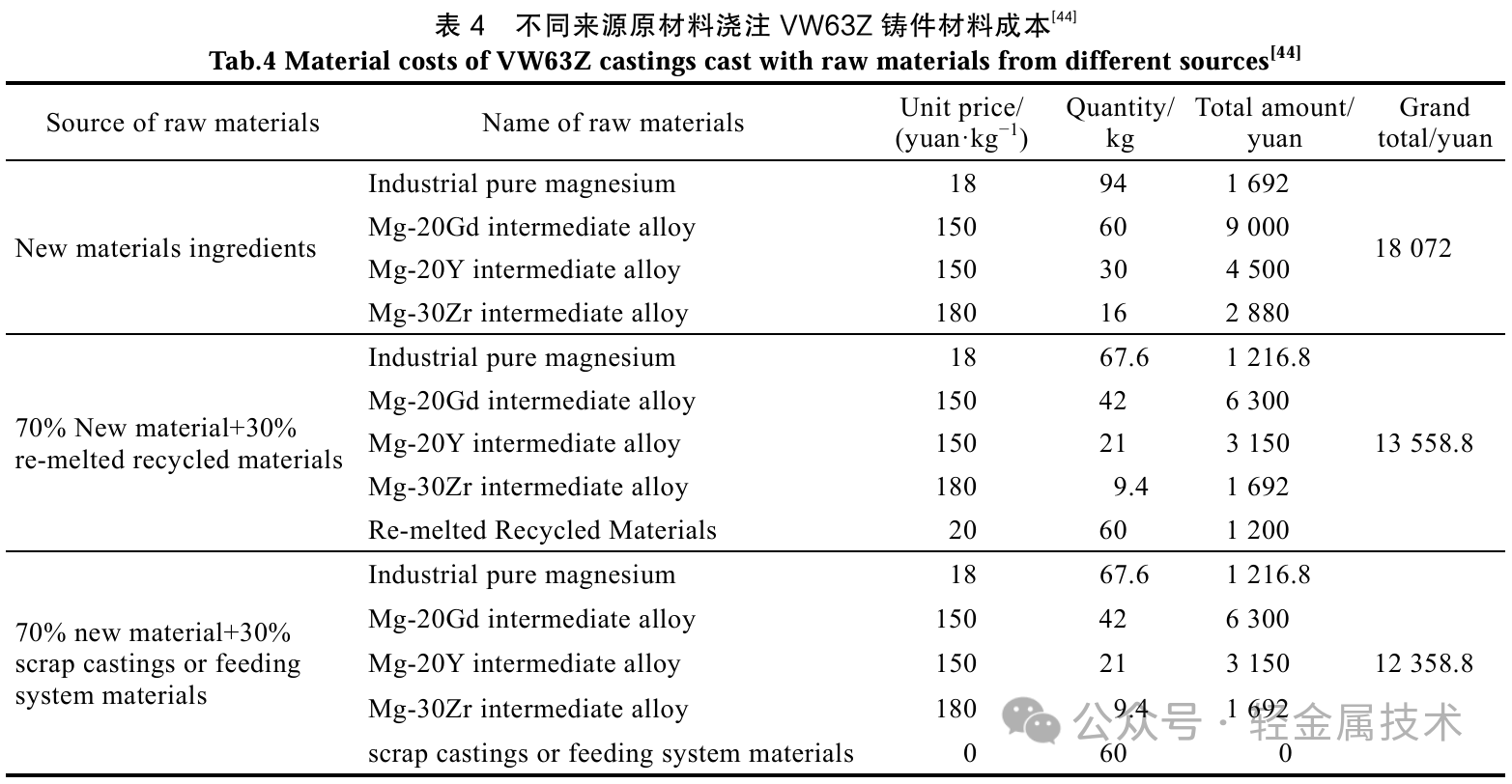 肖旅等[44]进行了稀土镁合金回炉料二次利用的初步探索,以VW63Z高强耐热铸造镁稀土合金为研究对象,分析了报废铸件、浇注系统料、重熔埚底料3种回炉料的添加对VW63Z合金组织和性能的影响,研究表明,3 种回炉料中均有更多的小颗粒Zr及溶解Zr,使用报废铸件的VW63Z合金力学性能最佳,使用重熔埚底料的最差,“溶剂夹杂的遗传性”是导致使用埚底料的铸件力学性能不佳的主要原因。且基于原材料价格计算,在200kg熔炼量下,当采用70% 全新料+30%废铸件或浇注系统时,相较于使用全新料,每炉次可节省约5700元。