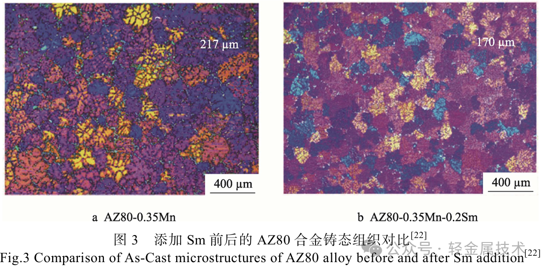 陈俊辰[20]研究了微量Sm的添加对Mg-8Al-0.3Zn-0.35Mn合金组织和力学性能的影响,发现Sm的添加可使β-Mg17Al12相显著细化,平均晶粒尺寸降低至47μm。0.2%(质量分数)Sm的添加使Mg-8Al-0.3Zn-0.35Mn合金的固溶态室温抗拉强度提升了24MPa,断后伸长率提升了3.2%。赫国强等[21]研究了不同含量稀土Y和Ce元素对铸造Mg-9Al-1Zn-0.3Mn合金组织和力学性能的影响,发现Y和Ce能显著细化铸态组织,且当Y和Ce的质量分数分别为0.6%和1.2%时,达到最优晶粒细化效果。