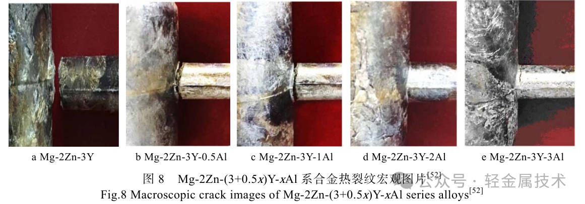 Zhang等[52]采用“T”模具研究了Al含量对Mg-2Zn-3Y合金热裂倾向的影响,结果表明,加入Al后生成的Al2Y可以作为α-Mg的形核位点,从而细化晶粒,此外合金的热裂倾向还能因此而降低。Feng等[53]采用计算机辅助冷却曲线分析了合金枝晶相干温度,综合分析了合金成分、凝固条件和微观组织对 热裂形成机理的影响。发现当在Mg-4.5Zn-0.5Zr合金 中加入1%(质量分数)Y时,合金的枝晶相干温度最高,脆性温度区间较宽,补缩能力最差,热裂倾向最高。何庆彪等[54]综合研究了低压铸造镁合金航天器复杂薄壁件缺陷的产生,研究发现,ZM5合金由于具有更宽的结晶温度范围,热裂倾向更大,不能简单靠压力补缩,最终通过上部增设冒口、底部放置冷铁等工艺措施改善了铸件的成形性。