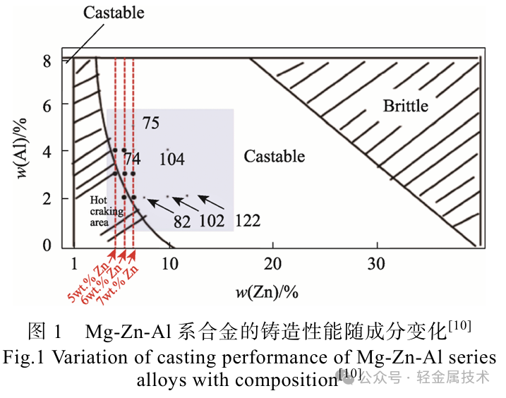Mg-Zn系合金具有很好的时效硬化效应,但疏松倾向较大,铸造性能差,其工业应用范围还远远不够。研究者们尝试添加其他合金元素对其改性,当前以RE或Al为主。当添加少量RE元素且Zn与RE原子达到一定比例后,可以形成稳定的I相、LPSO相(长周期堆垛有序机构),进而提升该合金系的力学性能。如Mg-5Zn-2.5Er(质量分数)合金晶界处形成了热稳定 I 相,使其具备较好的抗蠕变性能[5]。李杰华等[6]及王静[7]分别研究了少量Gd和少量Y对Mg-Zn合金的影响,发现合金中均形成了准晶I相,并且合金的力学性能有不同程度的提升。在Mg-Zn合金中加入Al元素可有效改善铸造性能,且Zn、Al元素含量对铸造性能的影响具有较强的规律性,如图1所示。