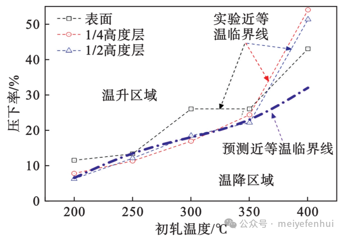图6为根据实验获得的AZ31B镁合金近等温轧制实测数据与通过近等温轧制经验公式获得的预测曲线。通过该判据建立的临界近等温轧制工艺曲线表明,轧制温度与压下率需保持同步增减的近似线性关系:当温度升高时,环境散热增强且材料变形抗力下降,须增大压下率以产生足够变形热;反之,则需降低压下率以维持热平衡。然而,该理论模型因未计入板材在轧制间隙及输送过程中的空气冷却效应,在高温区域对所需压下率的预测值会系统性低于实验实测值,存在明显偏差。因此,该判据可作为工艺优化的理论指导,但在实际生产中需结合具体实验数据加以修正。