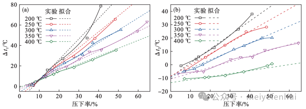 图5为对实验数据的线性拟合,建立了在不同轧制压下率和轧制温度下AZ31B镁合金中心层瞬时温升Δt1和轧后稳态温升Δt2的经验公式,为工艺参数的精准设计提供了理论基础。  式中:a=1.80986;b=-1.98197E-4;c=-2.18422E-4;t为轧制温度;R为轧制压下率。 由图5可见,经验公式的预测曲线与实验实测值吻合度高,能准确反映不同工艺参数下的热变形温度变化规律,为近等温轧制的工艺优化提供了量化依据。